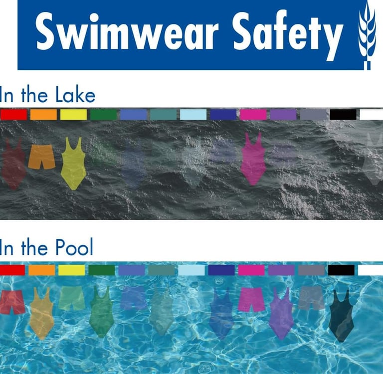 Color visibility saves lives — This image shows exactly what different colors look like submerged in real water conditions. Bright pink, red, and orange stand out clearly. White, light blue, gray, and navy nearly disappear entirely. Your eyes cannot save someone they cannot find. That is true whether you are five years old or fifty-five.